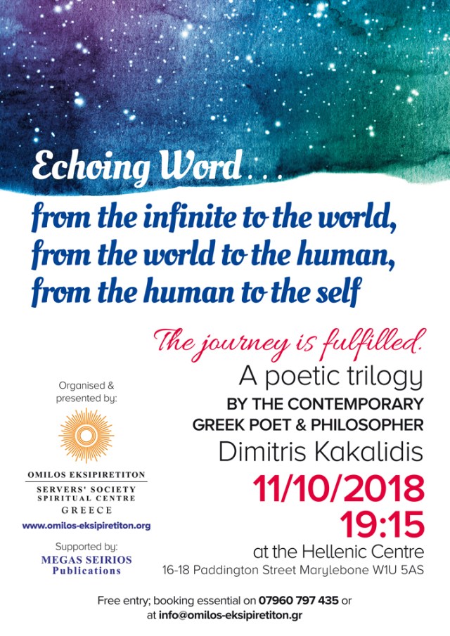 Following our previous successful events at the Hellenic Centre, London, which were also presented by the tv station Hellenic TV, this October we are holding a new event titled “Echoing Word… from the infinite to the world, from the world to the human, from the human to the self.” The journey is fulfilled. A poetic trilogy of the contemporary Greek poet and philosopher Dimitris Kakalidis.