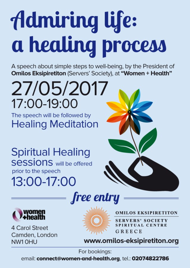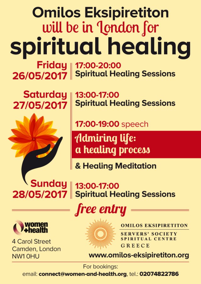 On 26th to 28th of May Omilos will be at Women + Health, a non-profit health centre in London, for three days to offer spiritual healing and healing meditation.